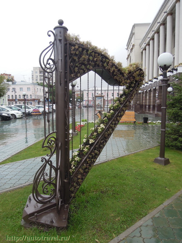 "Арфа" в Тюмени представляет собой металлическую скульптурную композицию, которая расположена рядом с Тюменской филармонией. Этот металлический музыкальный инструмент имеет значительные размеры, а территория вокруг него украшена цветником.